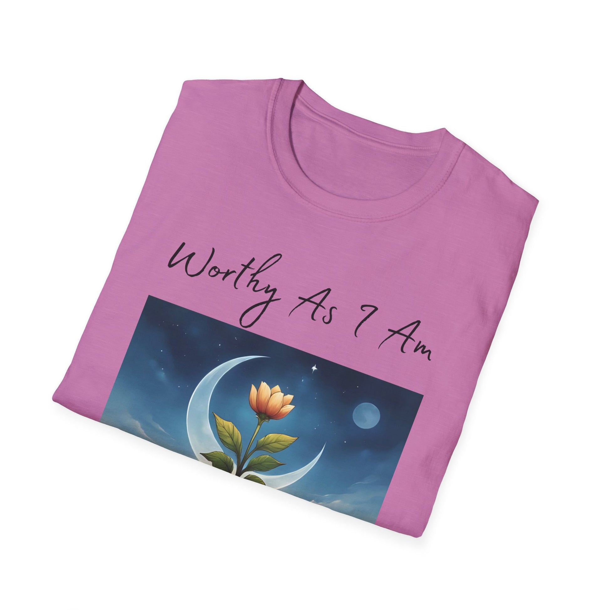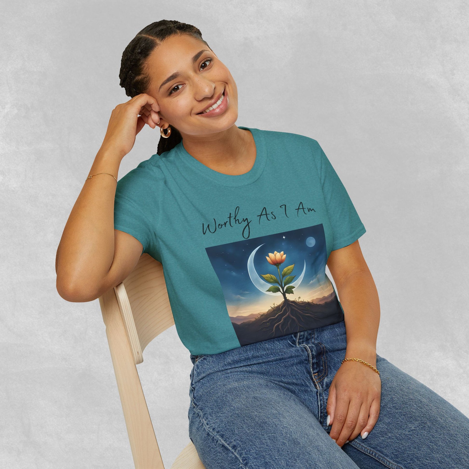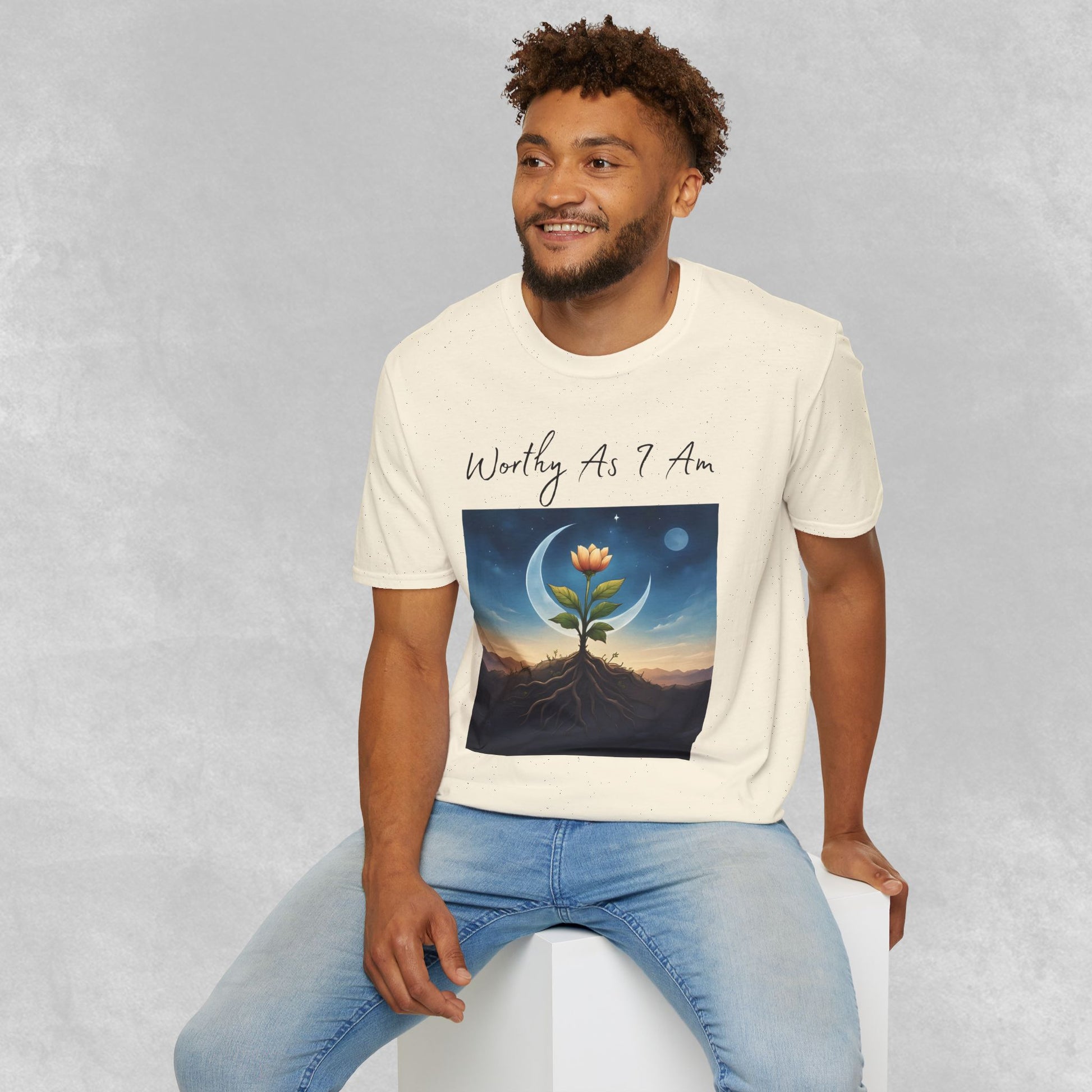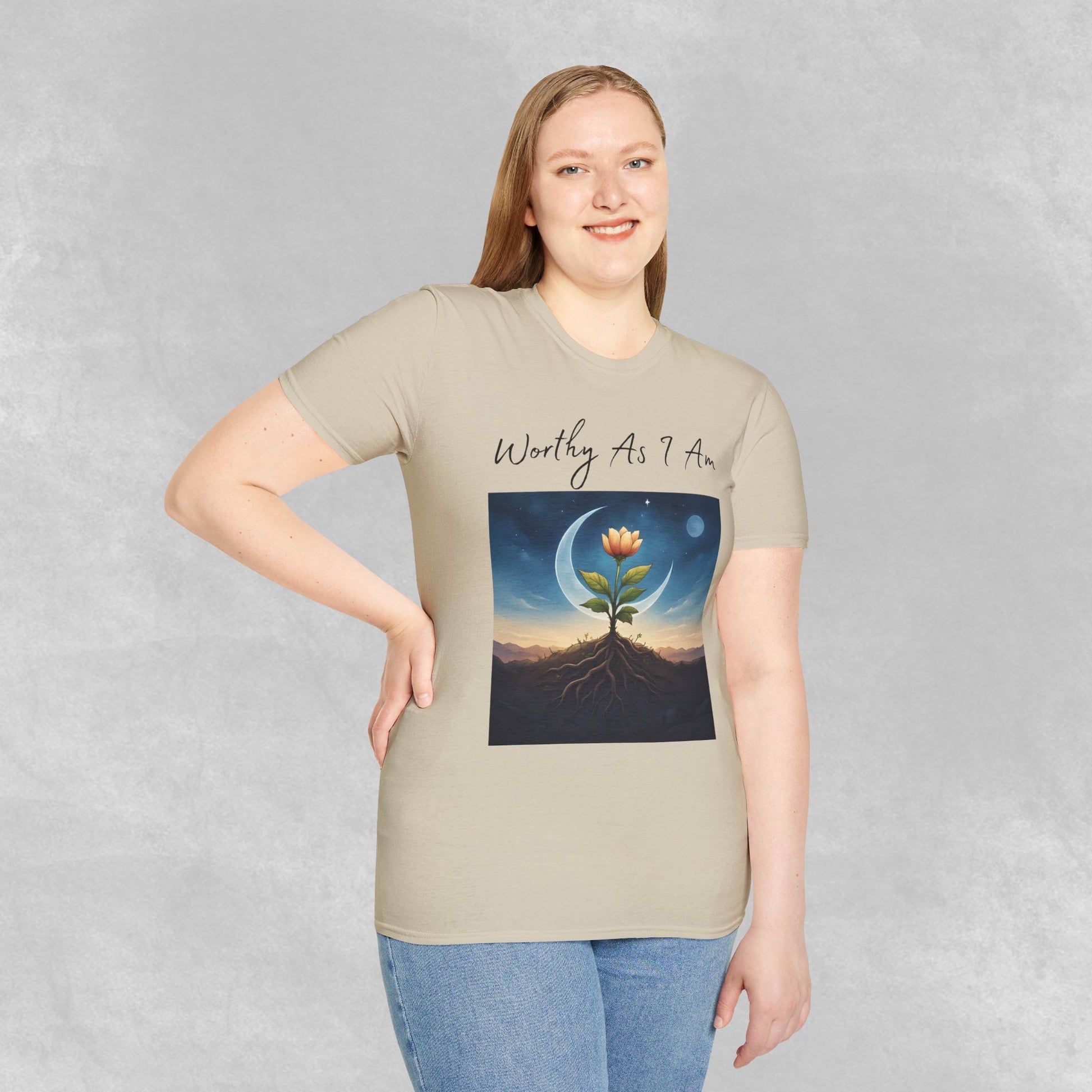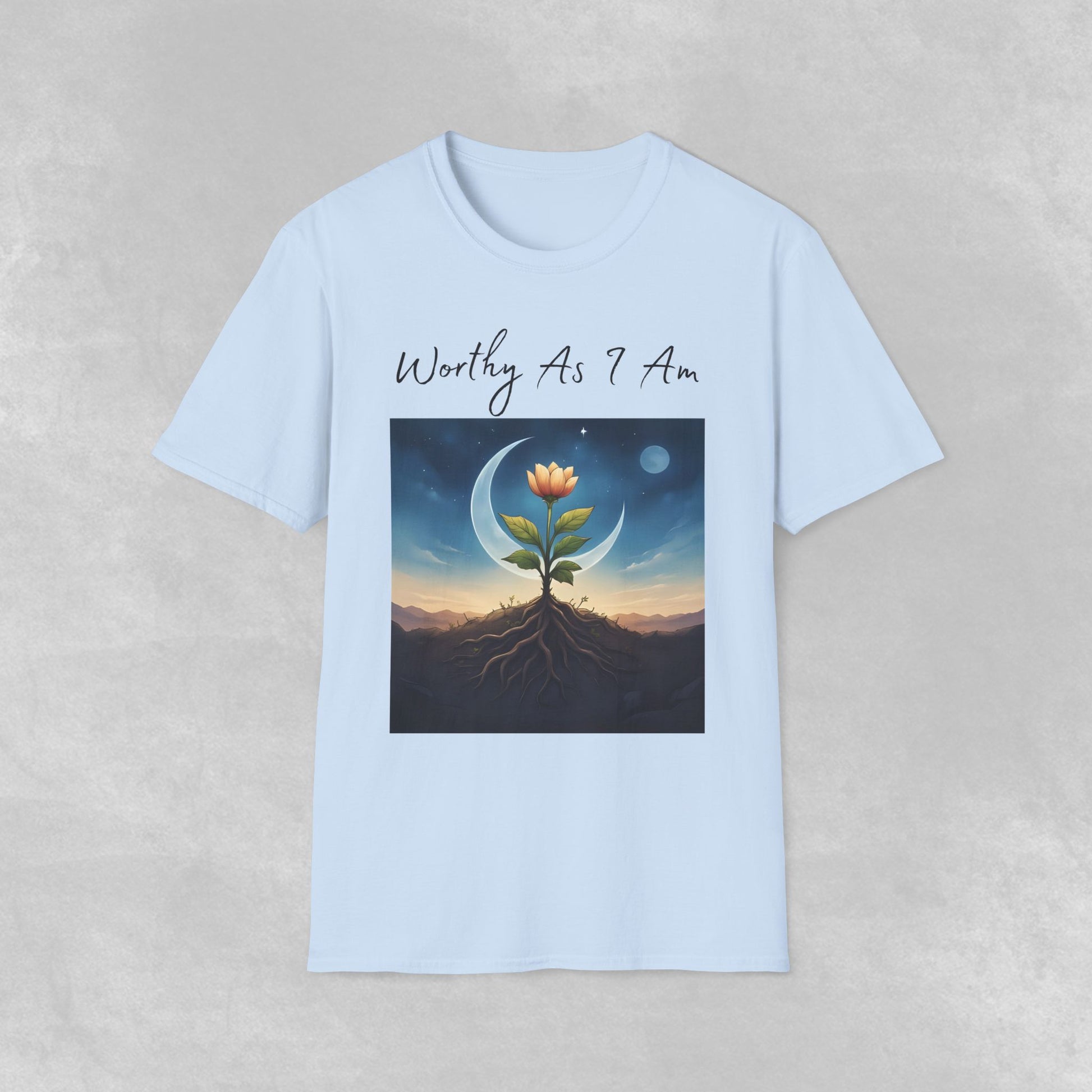 This evocative Worthy As I Am design captures a powerful truth—your worth is not measured by how much you bloom, but by the quiet strength beneath the surface. Featuring a radiant bud rising from deep, grounding roots under a crescent moon and twilight sky, this image honors growth, resilience, and the beauty of becoming.